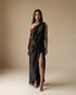 The Nyla Dress is designed in silky, fluid fabric with a lustrous sheen that drapes effortlessly over the body. A one-shoulder neckline with a soft tie accent adds sculptural detail, while a statement knot cinches the waist before releasing into a thigh-high slit. Clean lines, bold simplicity, and a touch of drama make Nyla the ultimate evening dress, cocktail statement, or occasion-ready gown.