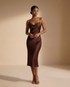 Cut in a deep chocolate satin, it introduces a richer, more understated tone suited to candlelit dinners, evening plans, and settings that lean more intimate.