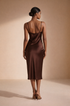The neckline falls into a soft cowl, creating a gentle drape across the bust, balanced by slim adjustable straps for a clean, minimal finish. Cut on the bias, the dress is designed to contour the body naturally, sitting closer through the waist before falling into a fluid midi length.